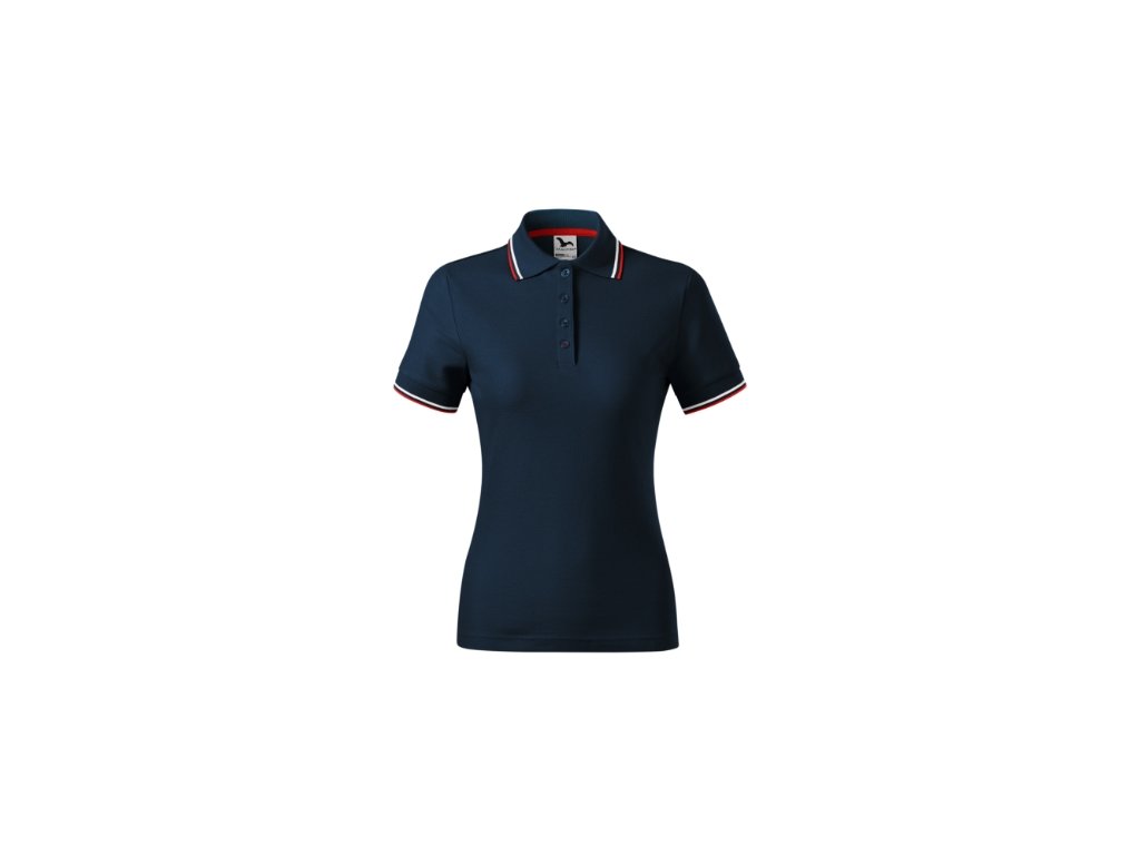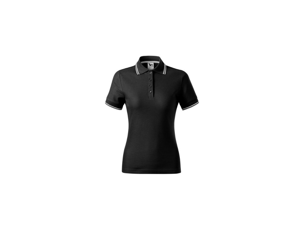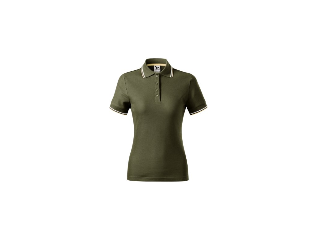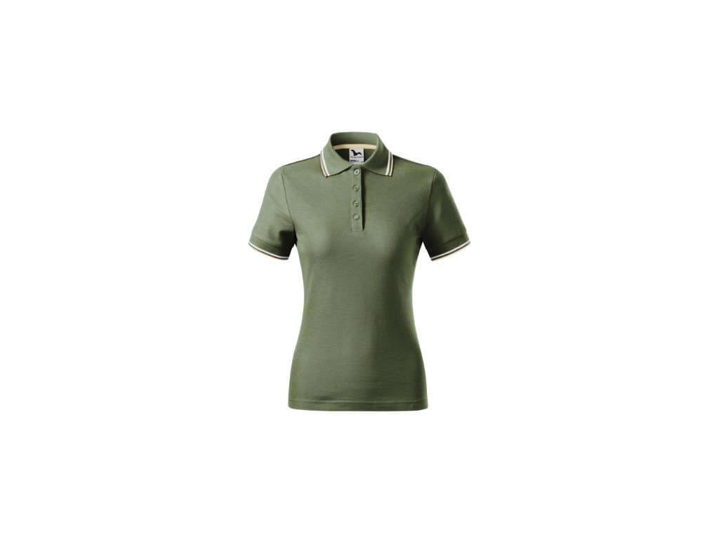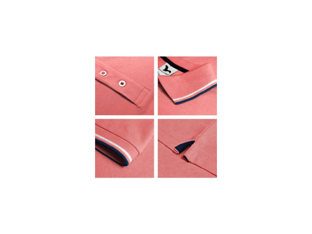 zľahka vypasovaný strih s bočnými švami, golierik z rebrového úpletu 1:1, 2 kontrastné pásiky na rukáve a golieriku, úzka léga so 4 gombíčkami vo farbe materiálu, spodný gombíčok prišitý kontrastnou niťou, vnútorná časť priekrčníka začistená kontrastnou páskou, spevnenie ramenných švov páskou, rozparky v bočných švoch spevnené kontrastnou páskou