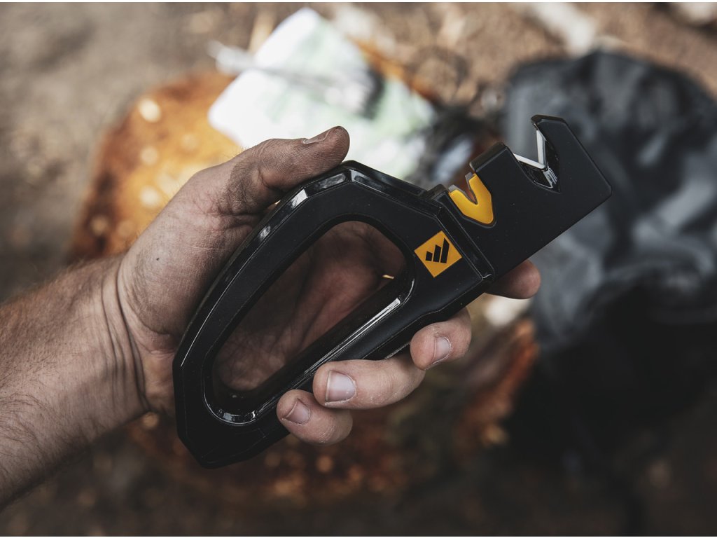Všestranná brúska na nože Work Sharp Handheld Pivot PRO Knife & Tool Sharpener, ktorú možno použiť v dielni, záhrade či v sklade.